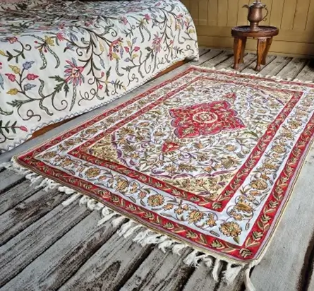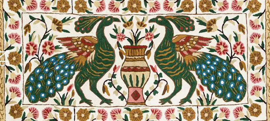 Chain stitch rugs are hand-embroidered floor coverings, crafted using looping stitches that create bold patterns and vibrant motifs. In Kashmir, this centuries-old art form transforms wool or cotton bases into striking rugs that blend tradition with timeless decorative appeal.