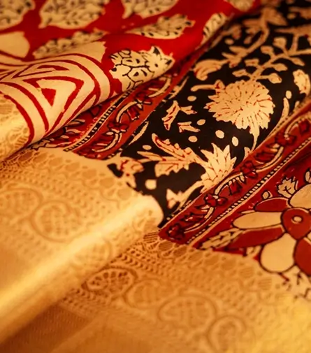 Kalamkari is a distinct hand-painted or block-printed technique that uses natural dyes to produce intricate mythological, floral, and geometric themes. It originated in Andhra Pradesh and requires accuracy and patience to produce bright, long-lasting, and culturally significant fabrics. Each Kalamkari work tells a story through its patterns, mixing centuries of tradition with artistic expression to create a decorative and functional textile for clothes and home décor.