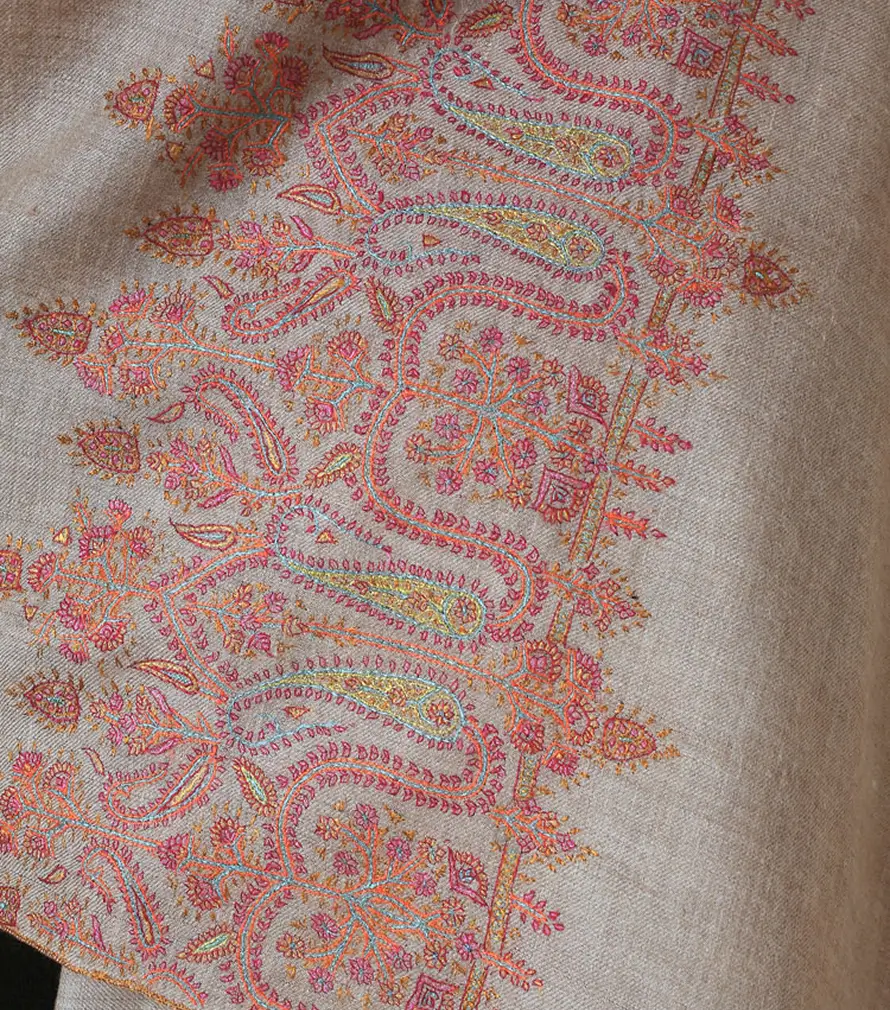 Jaali embroidery takes inspiration from the exquisite latticework found in Mughal architecture. These shawls have fine, openwork designs that provide a sensation of lightness and airiness while being warm and elegant. The embroidery’s perfection, transforms each Jaali shawl into a marvel of talent.